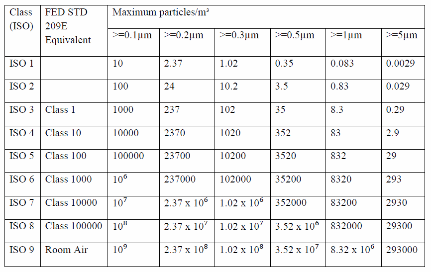 國(guó)際標(biāo)準(zhǔn)組織建立了九個(gè)潔凈室分類。這些標(biāo)準(zhǔn)被分配了從 ISO 1 到 ISO 9的分類。潔凈室分類基于房間的清潔度。這些分類被分解為每立方米有多少特定尺寸的顆粒,然后被分配一個(gè) ISO 分類。然后根據(jù) ISO 標(biāo)準(zhǔn)分配類。不同的行業(yè)需要不同的清潔度和無菌度。