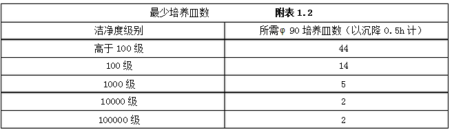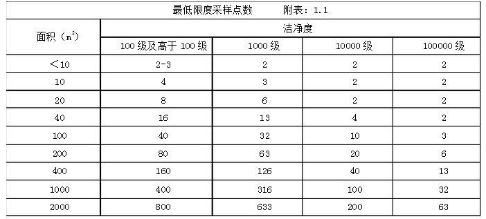 測定潔凈度的**低限度采樣點數(shù)按附表1.1的規(guī)定確定。每點采樣次數(shù)不少于3次,各點采樣次數(shù)可以不同。