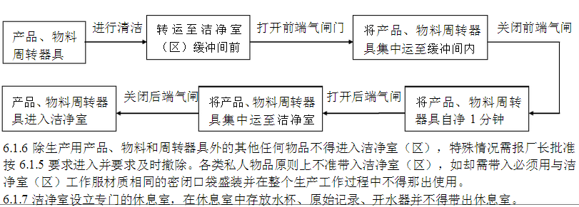 6.1.5產(chǎn)品、物料和周轉(zhuǎn)器具必須從物流通道進出,在從低潔凈區(qū)進入高潔凈區(qū)時,應(yīng)先打開物流通道緩沖間低潔凈區(qū)域一側(cè)的門,將一次需進入高潔凈室的物料全部推入緩沖間然后關(guān)閉低潔凈區(qū)域一側(cè)的門進行自凈,自凈時間不得低于1分鐘。自凈后在打開高潔凈區(qū)域一側(cè)的門將產(chǎn)品、物料一次全部推入高等級潔凈區(qū)域并關(guān)好緩沖間高潔凈區(qū)域一側(cè)的門。產(chǎn)品、物料周轉(zhuǎn)和周轉(zhuǎn)器具在從高潔凈區(qū)向低潔凈區(qū)周轉(zhuǎn)和運送時,按上述方法逆向傳送。 產(chǎn)品轉(zhuǎn)運**潔凈室(區(qū))流程示意圖:#p#分頁標題#e#